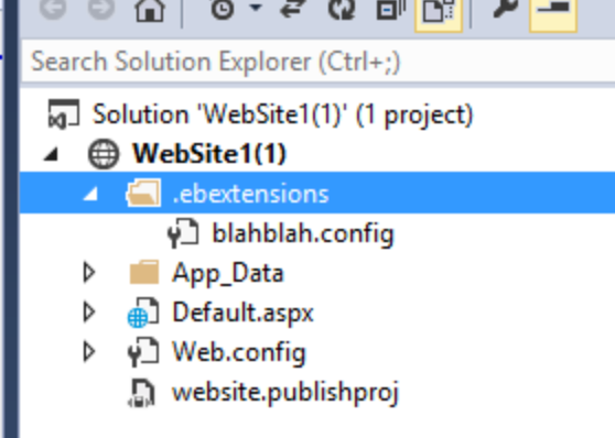 - Give this configuration file to you developers and ask them to place it in a folder called “.ebextensions” in the root of their visual studio project, as I’ve done in the screenshot below.