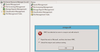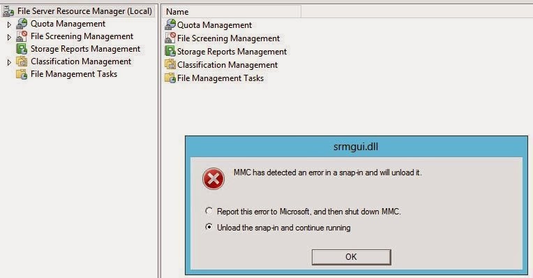 Whenever I tried to view the FSRM options screen, the MMC would crash and I’d get this error.